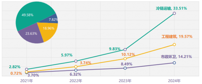 從新能源專用汽車的應(yīng)用場景分布看,市政環(huán)衛(wèi)、冷鏈運(yùn)輸、工程建筑構(gòu)成三大主力板塊,合計(jì)占據(jù)92.5%市場份額。其中冷鏈運(yùn)輸領(lǐng)域新能源滲透率達(dá)33.51%,居各細(xì)分領(lǐng)域之首,這主要得益于生鮮電商爆發(fā)式增長與疫苗等醫(yī)療冷鏈運(yùn)輸?shù)膭傂孕枨蟆?/span>